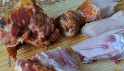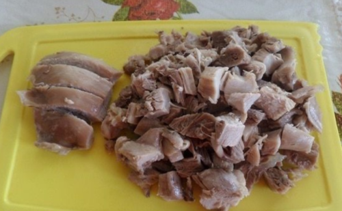 - Як тільки стегенце буде готовий, його дістаємо, м’ясо очищаємо від кістки і подрібнюємо.