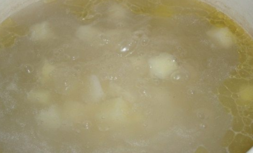 - Слідом відправляємо кубики картоплі, подрібнені часточки пряного овоча, всі приправи і сіль, варимо суп до повної готовності картопляних брусочків.