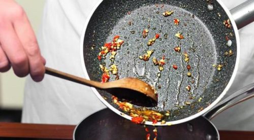 - На сухій сковороді протягом двох хвилин обсмажуємо зерна зіри, коріандру і запашного перцю. Потім підливаємо до приправ олія олив, засипаємо перець з часником і обсмажуємо 1,5 хвилини.
