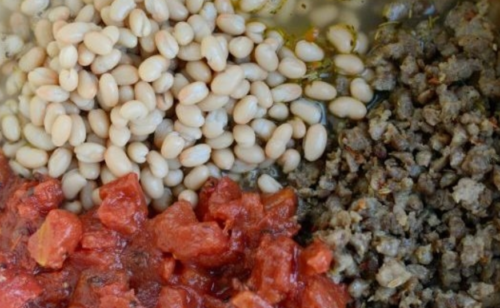 - Овочі посипаємо пряними сушеними травами, шавлією, засипаємо часник, перемішуємо і через дві хвилини повертаємо фарш, але вже разом з бобами і подрібненими помідорами, тушкуємо пару хвилин.