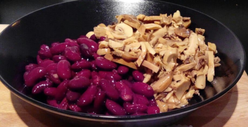 - Далі в закипілу каструлю засипаємо боби разом з корнішонами, різаними грибами, ковбасками і овочевий засмажкою, варимо.