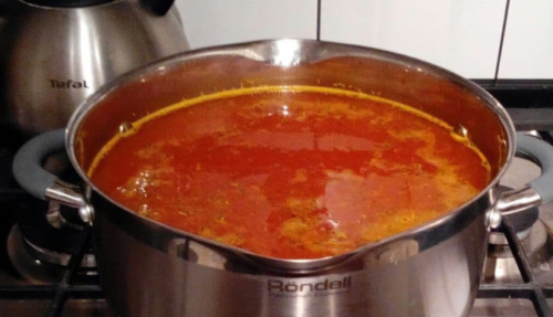 - У каструлю викладаємо з блендера отриману масу, вливаємо бульйон з прянощами і прогріваємо на вогні.