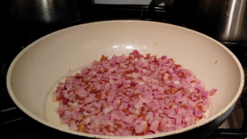 - Бекон нарізаємо дуже дрібно і обсмажуємо на сковороді до рум’яності, потім відразу відправляємо в суп.