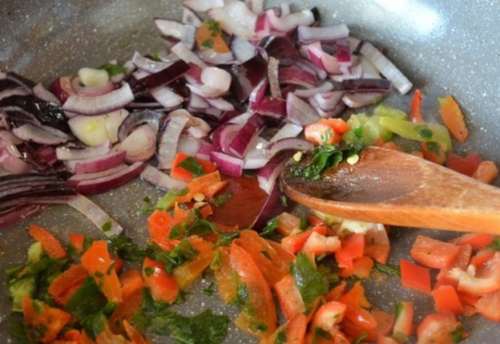 - Після до овочів засипаємо подрібнений шматочками томат, обсмажуємо ще 3-4 хвилини, вимикаємо вогонь і перекладаємо засмажку до вже готовим бобам.