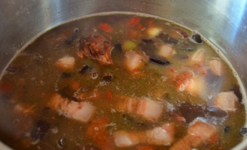 - Після закипання кладемо шматочки копченої курки і свинячі ребра, варимо 40 хвилин.
