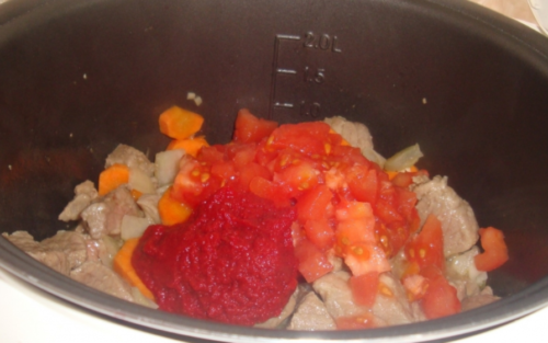 - За 2 хвилини до закінчення готування закладаємо томатну пасту, очищені від шкірки і дрібно нарубані помідори і подрібнений часник.