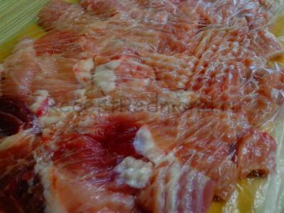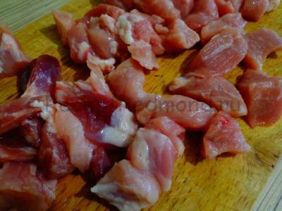 М’ясо помити, нарізати кубиками, в один шар викласти на обробну дошку і відбити кожен шматочок. Зручніше це робити через целофановий пакет або харчову плівку.