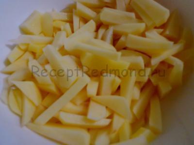 Картоплю почистити, порізати на шматочки (кожен розміром приблизно 3 см на 7 мл). Додати сіль, перемішати.