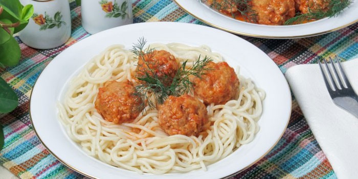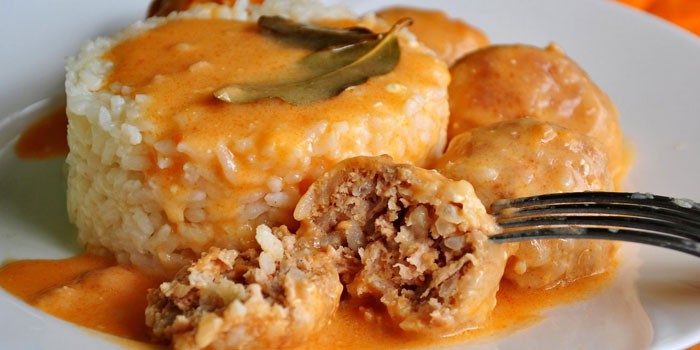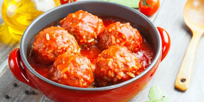 Звичним смаком з дитинства володіють тефтелі з рисом в соусі, якщо запекти їх в духовці з томатно-овочевою підливою. Вийде ефектне блюдо, добре насыщающее організм, що підходить для подачі дорослому і дитині. Воно поєднується з будь-якими гарнірами – тушкованою капустою, вареними квасолею, картоплею або свіжими овочами і великою кількістю зелені.