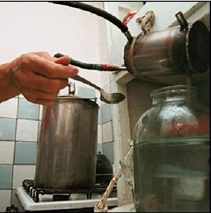 Як тільки температура досягла 85°C, дистилят збирають у нову посудину. Так звані «хвости» додають нову порцію браги, щоб збільшити міцність.