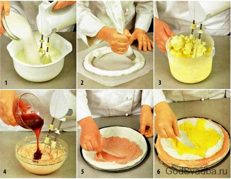 Білки виливаємо в миску, додаємо трохи солі і починаємо збивати. Продовжуємо протягом двох хвилин. Далі, не зупиняючись збивати міксером масу, повільно всипаємо цукор. Це займе близько п’ятнадцяти хвилин. Повинна вийти досить густа біла піна. Вона добре тримає форму, тому з неї легко буде зробити коржі. Їх для краси зробимо різного діаметра. Добре, якщо у вас є спеціальні круглі формочки відповідних розмірів. На деко кладемо пергаментний папір і за допомогою кондитерського мішка робимо акуратні кола діаметром 17, 21 і 24 см відповідно. Намагайтеся, щоб вони були однакової висоти. Відправляємо коржі в духову шафу при температурі 50 градусів і відкритих дверцятах. Як тільки вони підсохнуть, витягуємо їх і відправляємо на 4 години охолоджуватися.