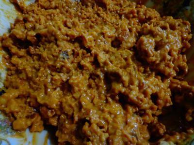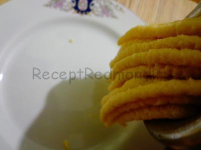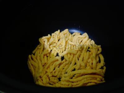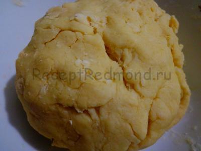 Після цього розділити тісто навпіл. Одну половину прибрати в холодильник. Змастити чашу мультиварки рослинним маслом. Решту тіста пропустити через м’ясорубку, викласти в чашу мультиварки.