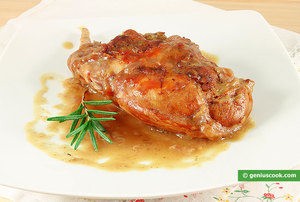 Цей рецепт кролика у вині передбачає виготовлення маринаду, в якому ретельно промиті порційні шматки тушки маринуються 8-10 годин. Щоб м’ясо після готування було м’яким і ніжним, його поміщають в глибоку посудину і заливають білим вином на потрібний час. Після того як м’ясо промаринується, що залишився маринад не виливають — він стане в нагоді для приготування соусу, в якій буде тушкуватися кролик. Далі шматки м’яса обвалюють у борошні і підсмажують на оливковій олії до утворення рум’яної скоринки. Таким же чином обсмажують цибулю і часник. Всі інгредієнти поміщають в спеціальний посудину, заливають маринадом з білого вина. Гасити м’ясо слід 1-1,5 години, в залежності від віку тварини.