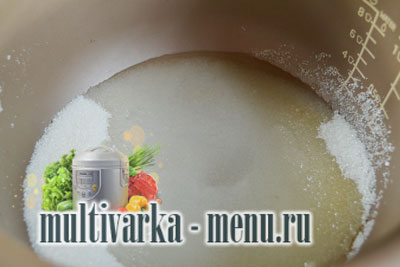 Тепер в чашу мультиварки насипаємо цукор і додаємо воду. Вибираємо режим на панелі мультиварки «Варити». Час 40 хвилин.