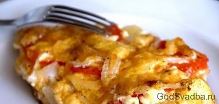 У форму викладаємо фольгу. Акуратно розкладаємо шматочки м’яса, щоб вони не накладалися один на одного. Далі створюємо шари на кожному шматочку: майонез, ананаси, цибуля, помідори, цибулю і перемішаний сир. Закриваємо всі щільно фольгою так, щоб не зачіпати сир. Але бажано не залишати ніяких щілин, щоб не виходив пар. Ставимо форму в духовку, нагріту до 180 градусів на 35 хвилин. Після знімаємо фольгу і даємо сиру подзолотиться близько десяти хвилин.