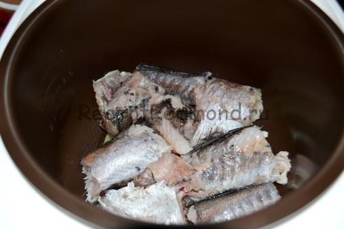 Коли риба хек повністю розморозиться, зливаємо воду і промиваємо в проточній холодній воді, потім складаємо в друшляк і просушуємо. Потім рибу солимо і поливаємо її лимонним соком, змішаним з цукром. Хек складаємо в каструлю і даємо просочитися соком хвилин двадцять.