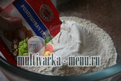 Потім в ємність відправимо борошно і до неї додаємо розпушувач і соду.