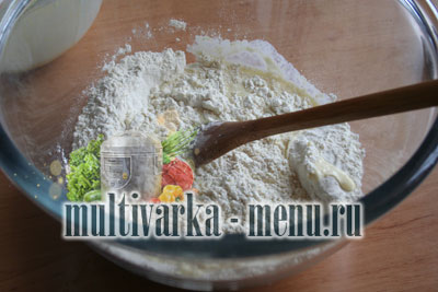 У ємність мультиварки відправимо маргарин і розтопити його в режимі «підігрів». Як тільки весь маргарин розтопиться, відразу ж вливаємо його в борошно і починаємо посилено замішувати тісто. Сюди ж додамо і кисле молоко (сколотини).