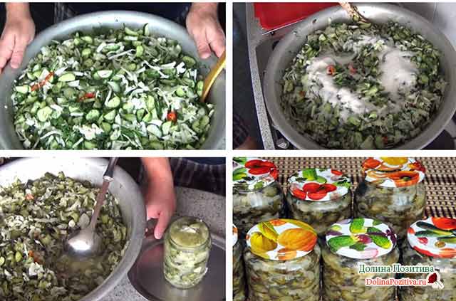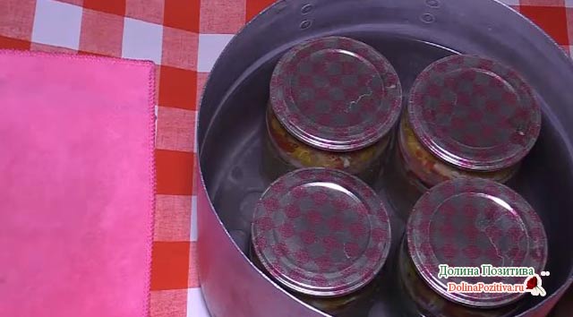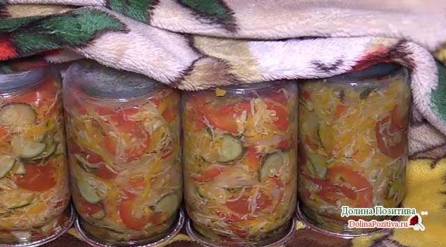 Стерилізуйте скляні банки, розкладіть салат. Закрийте залізними кришками, прокип’яченими протягом 10 хвилин. Перекиньте догори дном, дайте поступово охолонути під ковдрою.