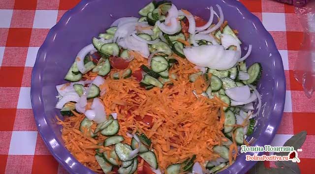 Салат вітамінний з капусти, огірків, помідорів, болгарського перцю, моркви, цибулі