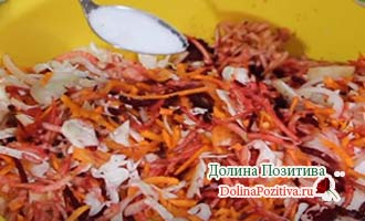 Складіть всі інгредієнти в одну посуд, додайте цукровий пісок, залишилася порцію солі і соняшникову олію. Приєднайте лаврові листки і горошинки чорного перцю. Влийте третину оцту, заявленого в рецептурі. Залиште салат помариноваться на одну годину.