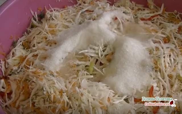 Подрібніть овочі: нашаткуйте капусту і цибулю крупно натріть моркву, солодкий перець поріжте соломкою, гострий – кільцями. Кріп дрібно порубаєте.