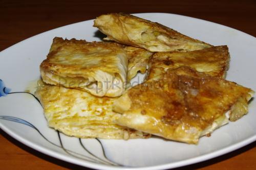 Збийте яйце і умочіть з усіх боків шматочки штруделя. Не забудьте про боковинках, через які може витікати в чашу начинка. Краще смажити шматочки на вершковому маслі, оскільки тоді смак буде на порядок відрізнятися від рослинного.