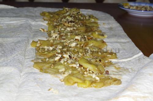 Всю цю масу з отриманою рідиною викладіть в окрему посуд, додайте туди горіхи, корицю і залиште остигати. Якщо ви покладіть яблука гарячими в лаваш, є ризик його прорвати.