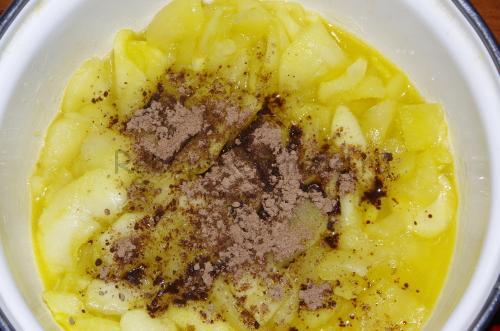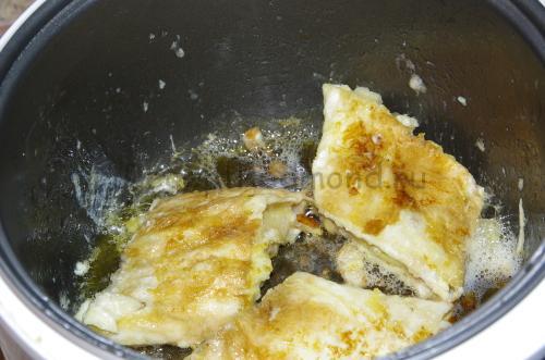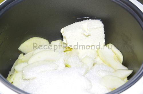 Зніміть з яблук шкірку, вичистіть серединку і наріжте часточками. Я знімаю шкіру з будь-яких яблук, так як тоді смак начинки стає набагато ніжніше. На режимі випічка протягом 10-15 хвилин потушкуйте фрукти зі 100 гр масла і 2ст. ложками цукру. Тримайте на вогні недовго — тут важливо, щоб вони розм’якшилися і пустили сік, а не перетворилися на пюре.