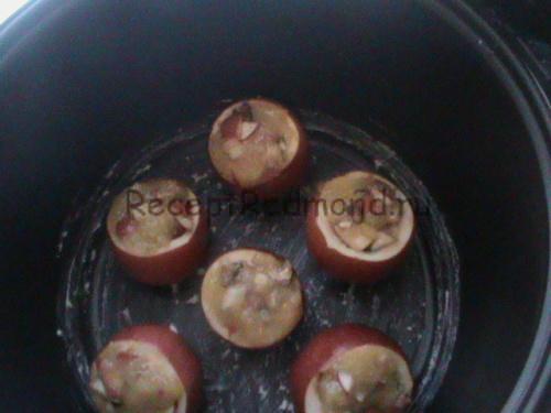 На мультиварці вибираємо режим «випічка», і виставляємо на таймері 30 хв. Час приготування може трохи відрізнятись від даного, це залежить від вибраного вами сорти яблук, м’які і більш пухкі печуться не багато швидше. Тому після закінчення 20 хв. необхідно перевіряти його готовність за допомогою зубочистки або сірники. Готові яблука повинні бути м’якими і при цьому не розвалиться на частини, але навіть якщо це станеться, не впадайте у відчай, на смакових якостях це ніяк не відіб’ється.