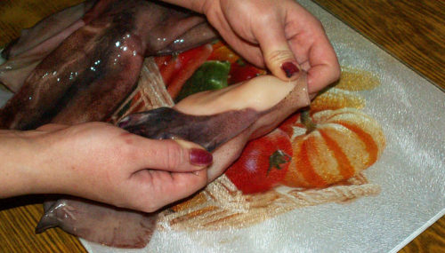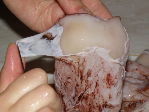 - Знімаємо шкірку пальцями з великої частини кальмара, а з тонкою – соскабливаем ножем.