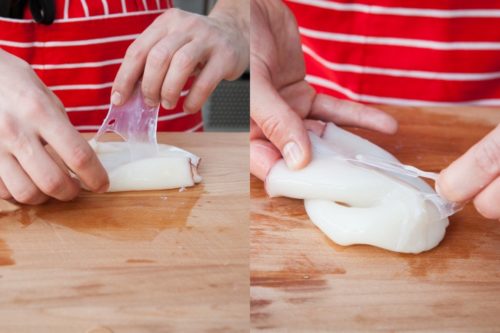 Завдяки різкій зміні температура плівка з тушки кальмара зійде сама. Залишиться тільки допомогти їй зробити це швидко.