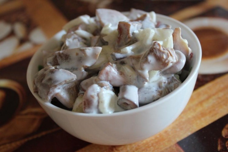 Кількість продуктів вибирається за бажанням. На один гриб потрібно взяти одне яйце і 1 ст. ложку сметани. Після того як лісовий урожай був вымочен і отварен, необхідно розрізати на великі шматки. Потім обсмажити до появи рум’яної скоринки. Додати подрібнену цибулину і посолити.