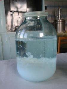- Фортеця рідини більше 60% сприяє більш якісному згортання білка. На 10 літрів рідини, що містить алкоголь додається 100 г пастеризованого знежиреного молока;
