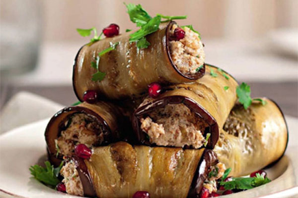 Шах 6. Викласти цей соус сациві на смажені смужки баклажана викласти пасту і загорнути в рулетики.