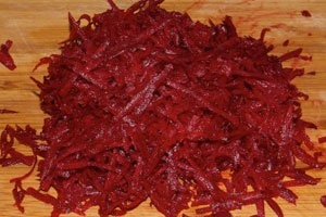 Візьмемо помитий і почищений буряк, нарізаємо соломкою і відправляємо на сковорідку, де тушкуємо з невеликою кількістю рослинного масла.