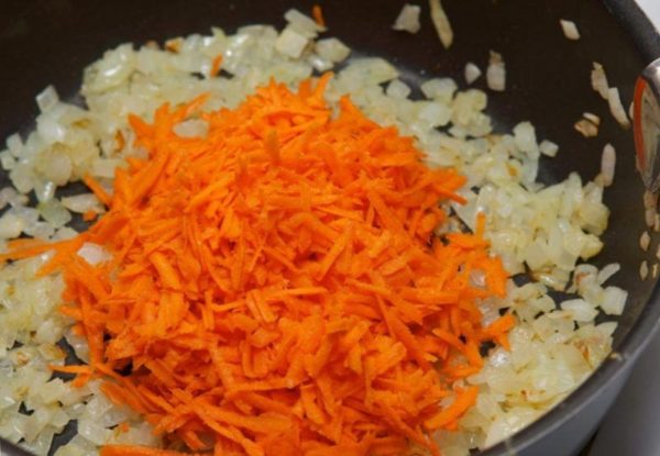 Потім додамо трохи оцту і томатну пасту і продовжуємо тушкувати. Слідом обсмажуємо цибулю з морквою і відправляємо до буряка. Злегка посипаємо борошном і все ретельно вимішуємо, не знімаючи з вогню.