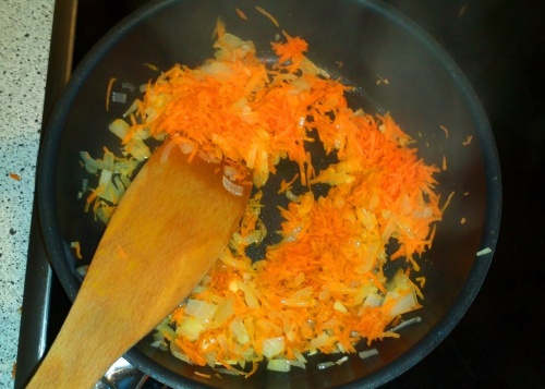 Для приготування за смаження, чистимо й нарізаємо одну середню моркву і цибулю так, щоб вийшли кубики 5 на 5 міліметрів.
