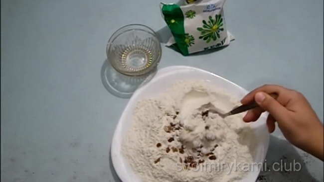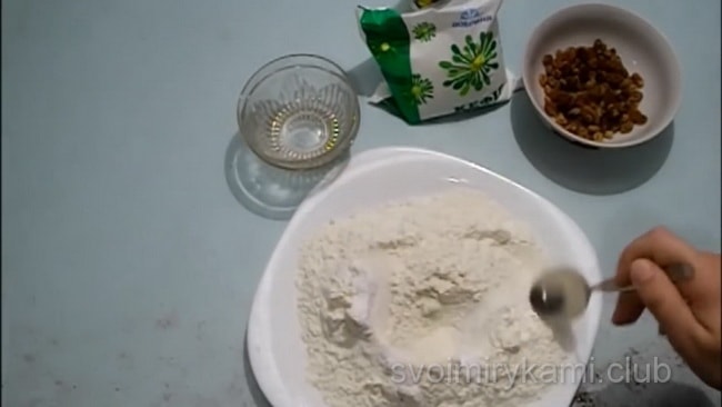 Просійте борошно і додайте всі інші інгредієнти. Перемішайте.