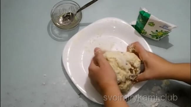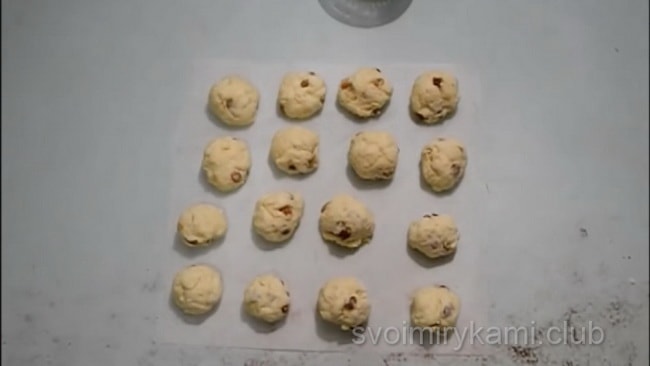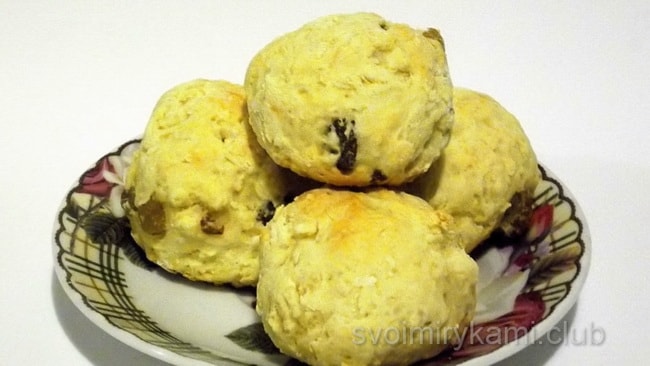 З’єднайте сипучі інгредієнти з кефіром і вершковим маслом. Додайте родзинки. Обов’язково потрібно самим регулювати густоту тіста. Воно не повинно бути дуже густим і тугим, але і не повинна розтікатися. Замісіть тісто. Надайте йому форму коржі, вона повинна бути товщиною близько 10 мм Виріжте з цієї коржі кола підручними засобами: склянкою з тонкими краями або спеціальною формою для печива.