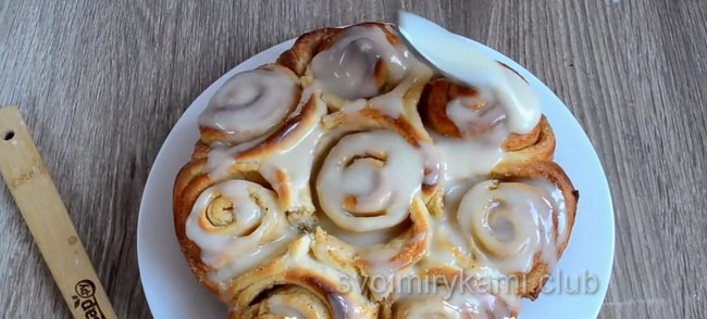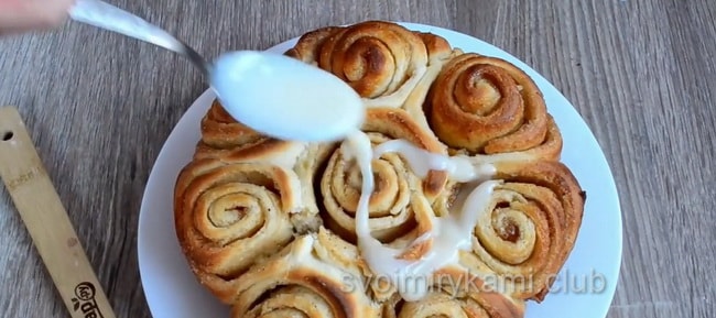 Глазур для булочок Синабон вже є прикрасою. Але можна поекспериментувати і посипати їх маком, також шоколадною або горіховою крихтою. Якщо ви приготували ці булочки на якесь торжество, то їх можна прикрасити кремовими трояндочками або іншими візерунками.