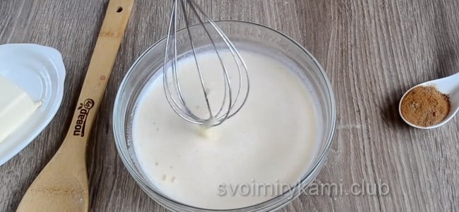 З’єднуємо яйця кімнатної температури і злегка розм’якшене масло. Гарненько перемішуємо. Вливаємо цю суміш в опару. Знову перемішуємо.