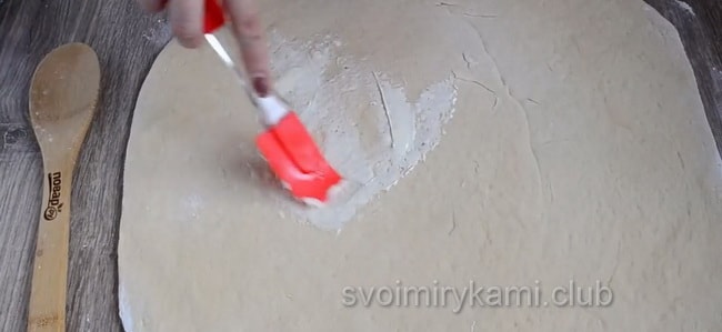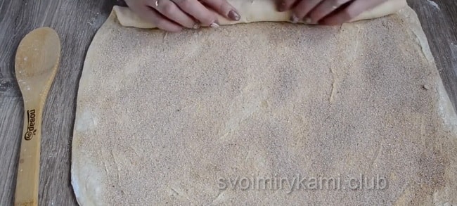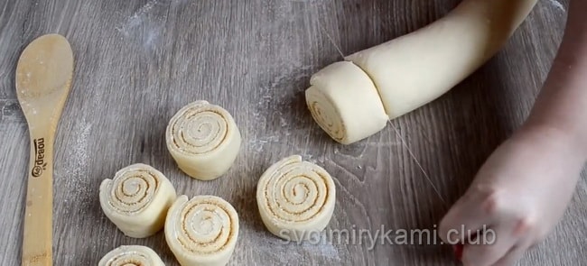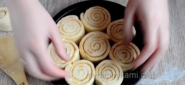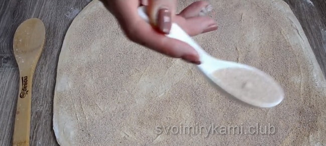 Коли тісто підійшло кілька разів, приходить час для формування булочок. Розкачуємо тісто, повинен вийти прямокутник, розміром приблизно 30 мм на 40 мм. Намазуємо його вершковим маслом, потім посипаємо сухою начинкою. Кількість начинки регулюйте за своїм розсудом. Якщо ви любите насичений аромат кориці – кладіть побільше. Потім загортаємо тісто в рулет і ріжемо його приблизно на 12 частин. Кладемо рулетики на деко і залишаємо на 15 хвилин, щоб вони трохи підійшли.
