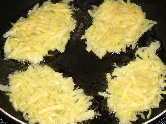 6. При бажанні – викладаємо картопляні оладки на форму, застелений промасленим папером, посипаємо кожен невеликою кількістю подрібненого твердого сиру, відправляємо в духовку (180 градусів), чекаємо 5 хвилин.