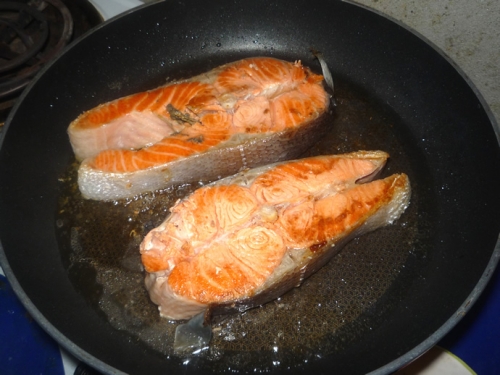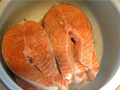 Зверніть увагу, що шматки риби не повинні бути дуже тонкими, інакше форель вийде суха. Далі рибу потрібно посолити і приправити спеціями. Їх вибір, в першу чергу, залежить від вашого смаку. В моєму розумінні, добре доповнюють смак риби імбир або часник (як правило, я додаю щось одне). Також, щоб риба була соковитою, її необхідно скропити соком цитрусових. Я віддаю перевагу лимон або апельсин. Залиште рибу хвилин на 15-20 – хай просочиться ароматами спецій – і приступайте до смаження.