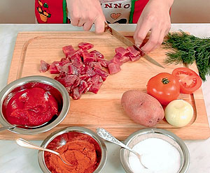 Вирізка дрібно нарізається шматочками, так, щоб не довелося користуватися ножем під час їжі. На розпечену сковороду кладуть шматочки яловичини і обсмажуються під закритою кришкою. Обсмажувати м’ясо потрібно до тих пір, поки не випарується сік, виділений при смаженні. Після цього в сковороду кладуть дрібно нашатковану цибулю і обробляється до золотистого кольору. Тим часом ви можете очистити помідори від шкірки і порізати дрібними кубиками. Якщо ви використовуєте томатну пасту замість помідорів, то після обсмажування цибулі в сковороду додаються 2 ложки томатної пасти, все змішується і гаситься ще 4 хвилини. Якщо ви додаєте свіжі помідори, то кожен кубик необхідно придушити ложкою в сковороді і пасерувати близько 5 хвилин.