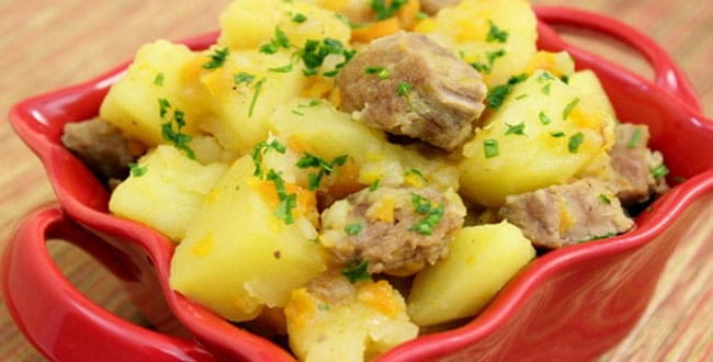 - Картопля – це основна страва. До нього не потрібно подавати ще щось м’ясне або рибне, так як м’ясо вже в його складі. Якщо вам здається, що цього не достатньо, то можете додати до картоплі смажене або тушковане м’ясо.