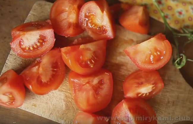 • Помідори черрі розрізаємо на дві половинки. Звичайні великі помідори розрізаємо навпіл і кожну половину розрізаємо вздовж на кілька часточок.