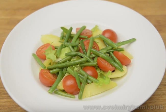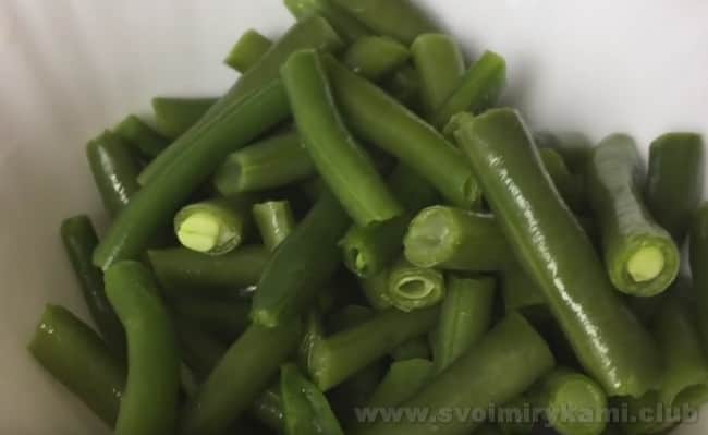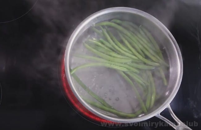 • А також опускаємо молоду стручкову квасолю на п’ять хвилин у киплячу воду. Остуджуємо і ділимо на дві-три частини.