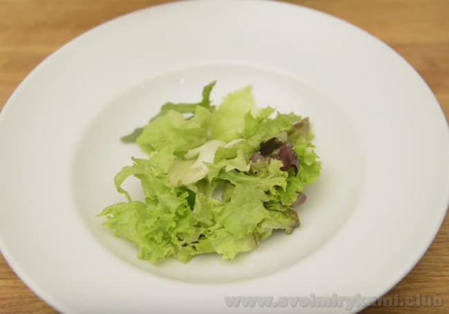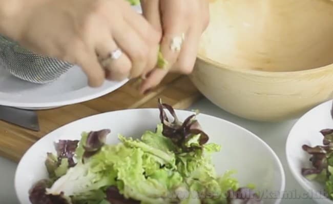 • Рвемо Руками вимиті листя салату і викладаємо на підготовлене блюдо або на тарілки. До листя салату можна додати рукколу і шпинат.